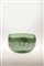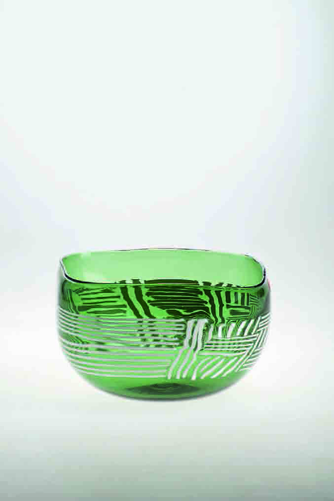Benjamin Moore Coppa in vetro verde con fascia centrale decorata da sottili canne in lattimo verticali e orizzontali, 1978 circa, cm 12,5x20