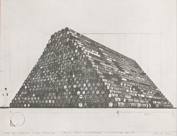 Christo, Tonneaux metalliques, project for Galleria Nazionale d'Arte Rome, 1968 Serigrafia, es. 47/100, cm. 54x70 Firma in basso a destra. Certificato di autenticità e garanzia a cura della Meeting Art Casa d'Aste,Vercelli. Bibliografia: "Christo, prints and objects", Schellmann Editore, al numero 19.