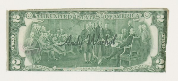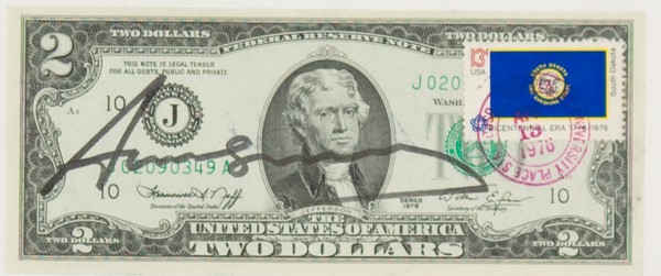 Andy Warhol, Two Dollars, Banconota da 2 Dollari, cm. 7x16 Firma autografa al centro. Expertise sulla firma a cura di Frank P. Garo (Forensic Handwriting Examiner), Coopersburg (Usa). Firma stampata dell'artista sul retro.