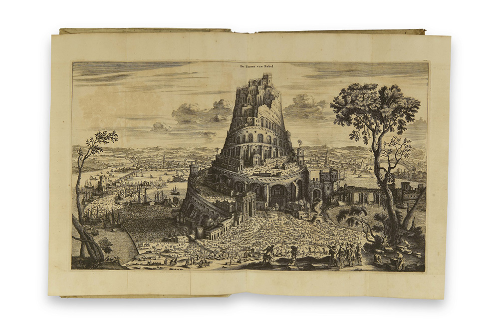 2 parts in one volume, elephant folio and 4to (381 x 245mm). Additional engraved title, title in red and black with woodcut device, 16 double-page engraved plates of which one folding, numerous engraved illustrations (without *4 possibly blank?, occasional light stains). Contemporary Dutch blindstamped vellum, gilt title on spine label (lightly soiled, front hinge partly cracked).