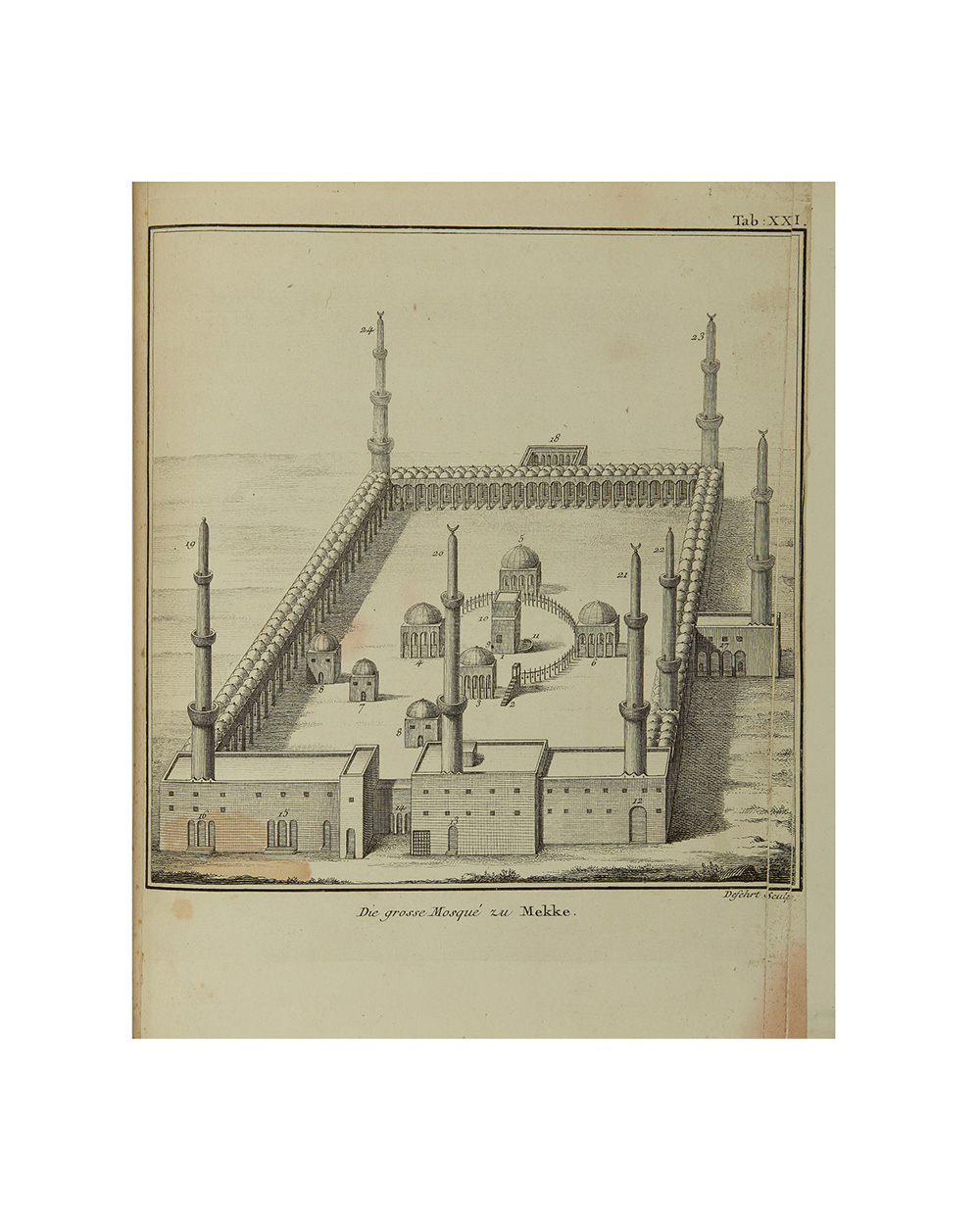 4to (251 x 188mm). Vignetta calcografica al frontespizio, 25 tavole e carte geografiche incise in rame inclusa una carta geografica dello Yemen colorata nei contorni non numerata e una tavola ripiegata (frontespizio con tracce di sporco, manca la dedica in a1-a2). Legatura posteriore in mezza pelle con titolo sul tassello rosso al dorso, dorso decorato in oro (lievemente graffiata). Provenienza: Franz Pollack Parnay (ex libris).