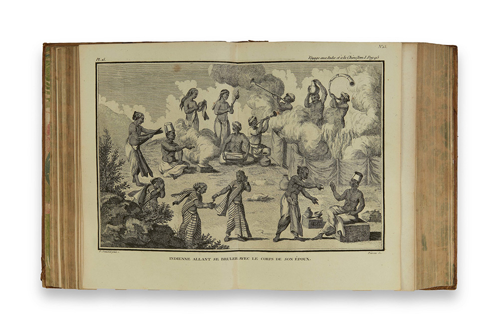 2 volumi, 4to (245 x 190mm). Occhielli, 138 (su 140) tavole incise da Poisson e altri artisti su disegni di Sonnerat, fregi xilografici (mancano la tavola 80 e 119, occasionali lievi bruniture). Pelle coeva, dorsi e piatti decorati in oro, tagli marmorizzati (lievi difetti). Trovandosi i due volumi nella loro legatura originale d’epoca è presumibile pensare che le due tavole mancanti non fossero mai state rilegate nei volumi. Provenienza: ex libris con stemma araldico - piccolo timbro privato circolare agli occhielli - “G” su etichetta di segnatura privata al dorso. Cordier Sinica III, 2102 ('Pour la beaute des epreuves, cette edition est preferable a celle de 1806'); Cox I, p. 300 ('valuable work'); See Madeleine Ly-Tio-Fane, Pierre Sonnerat, 1748-1814: an Account of His Life and Work, 1976. (2)