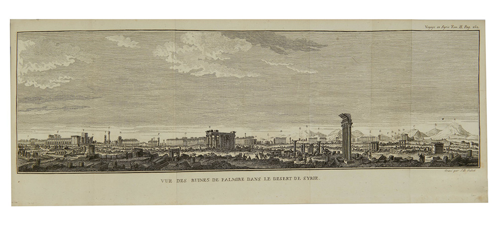 2 volumi, 8vo (195 x 124mm). Occhiello al secondo volume, mappa del tempio di Balbek, due vedute raffiguranti Balbek e Palmira, due cartine geografiche della Siria e dell’Egitto, tutte incise e ripiegate (senza occhiello al vol. I e ultime bianche, il vol. II inizia con p1-p2 e non con p1-p4 come descritto in SBN). Pelle coeva decorata a spruzzo, dorso con etichetta in pelle e decorato in oro. (2)