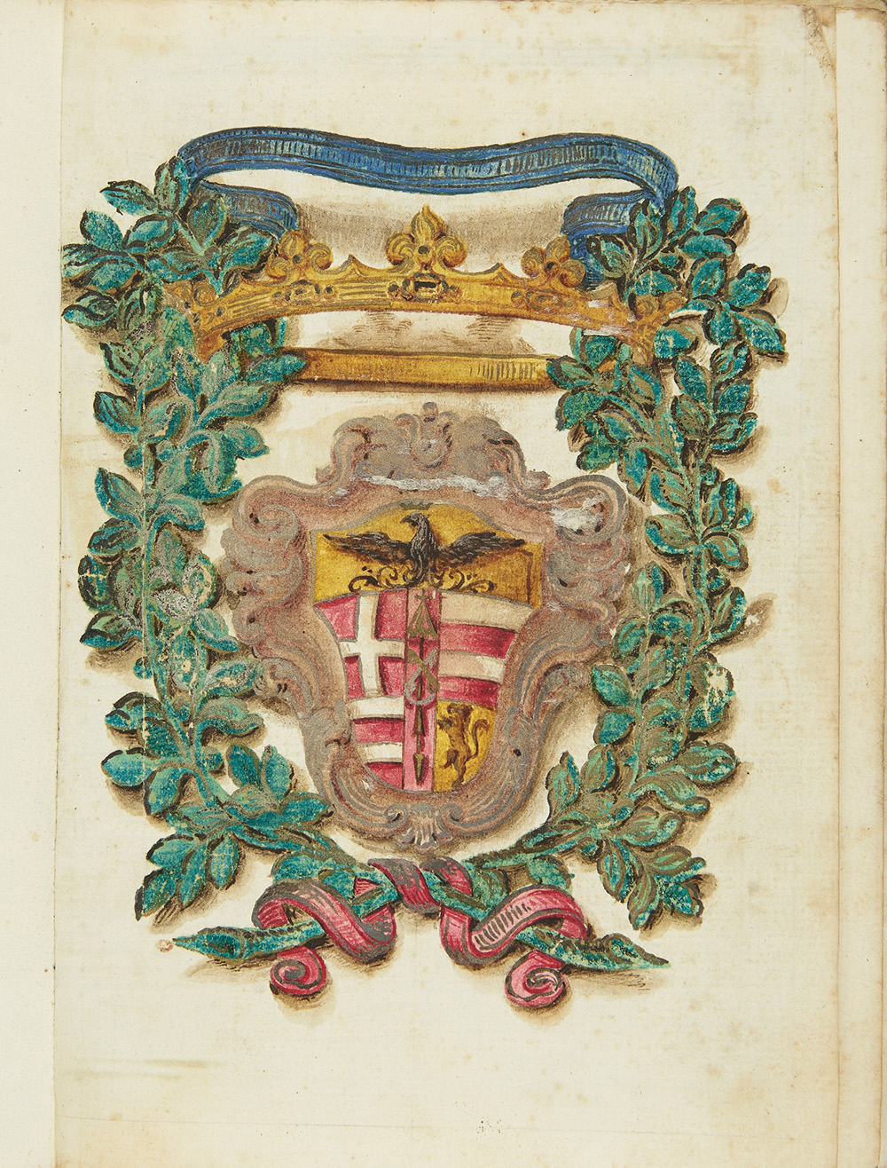 A liturgic manuscript dedicated to Margherita Pia de Sabaudia Zeane. On l. recto are contemporary arms with a lion and eagle. Title (l. 1 recto) is within a green and gilt frame; floral designs at end of the Bolla (l. 3verso), l'Oratione da dirsi avanti la Comunione (pp. 162-163) and the end of the Officium (p. 167). The paragraph initials are in typical Renaissance script, in bue on light blue. The codex contains 1) Tavola Temporaria delle Feste Mobili (l. 2recto e verso); 2) Bolla of Pio V intorno al recitare l'Officio della B.V. Maria (l. 3recto and verso); 3) Calendario con le festività e i Santi (ll. 4recto-9verso); 4) Oratione da dirsi avanti al Divino Officio (l. 10recto and verso); 5) Officium (ll. 11recto-94recto = pp. 1-167).