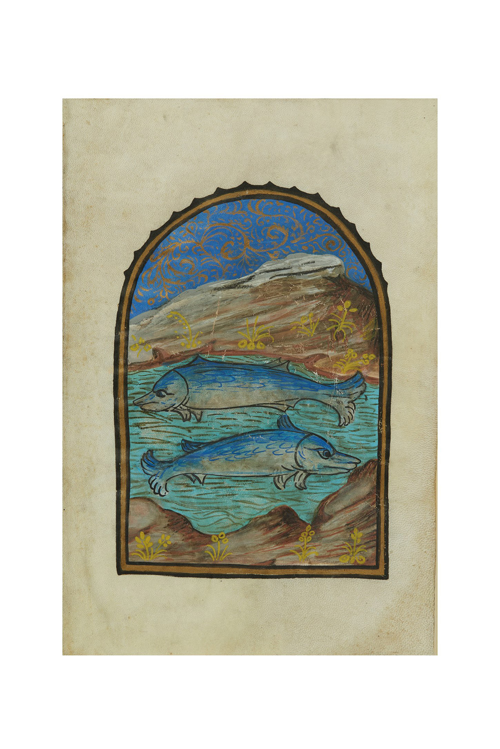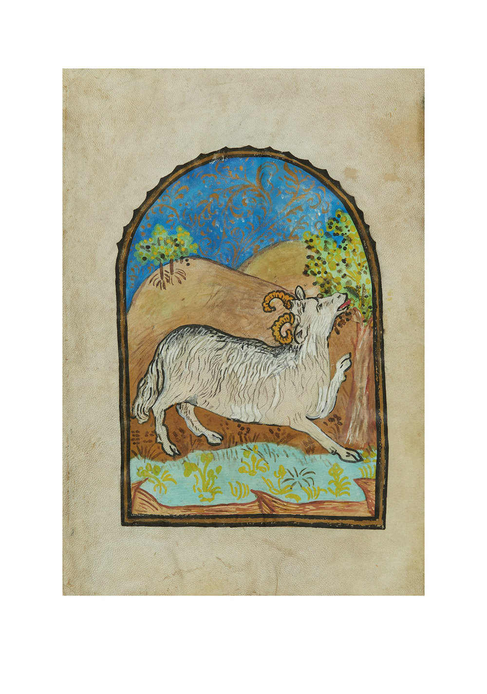 12 leaves each containing a zodiacal symbol within a decorative border. Bright colours. Manuscript on vellum (ll. 1, 12, I'; 370 x 250mm). 18th-century calf, a reimbotage, gilt arms (lightly rubbed)