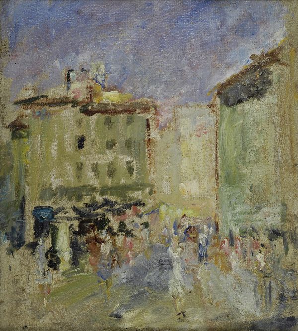 Eduardo Gordigiani (Firenze, 1866 - Popolano di Marradi, 1961) Paesaggio con figure Olio su tela, cm. 48,5x45 Firmato sul verso.