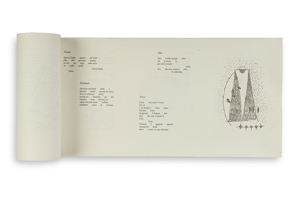 Copy n. 38 of 99 signed by the artists from a total edition of 140. 7 original etchings printed at the Giorgio Upiglio press, the composition is by Ruggero Olivieri on Zerkall paper. Binding and box are by Giovanni de Stefanis.