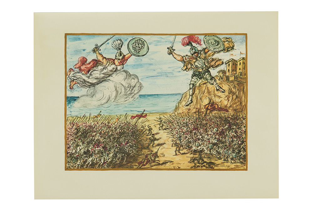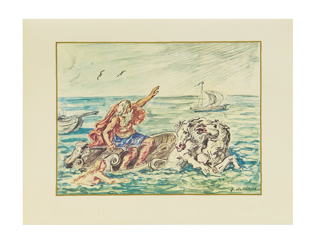Un volume e un cofanetto di tavole, folio elefante e 4to (500 x 350mm). Testo in greco e italiano, 26 litografie a colori da Giorgio de Chirico preservate nel contenitore in noce massello. Legatura editoriale alla cappuccina in pelle di capra naturale, bassorilievo eseguito da Guido Veroi in bronzo dorato antico, custodia esterna in pelle di cinghiale scamosciata (lievi e sporadici graffi). (2)