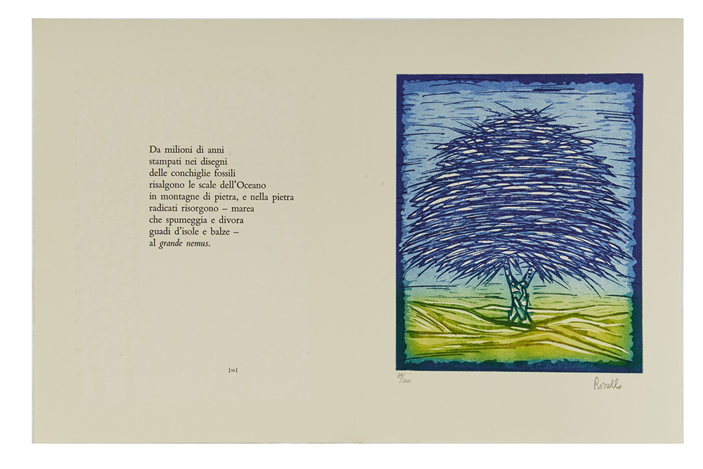4to (327 x 250mm). Cartone editoriale originale e custodia originale, entrambe con stampa colorata di un albero, 3 acquetinte originali a colori di Mario Rossello firmate dall'artista, altre pagine con fregi decorativi stampati a secco.