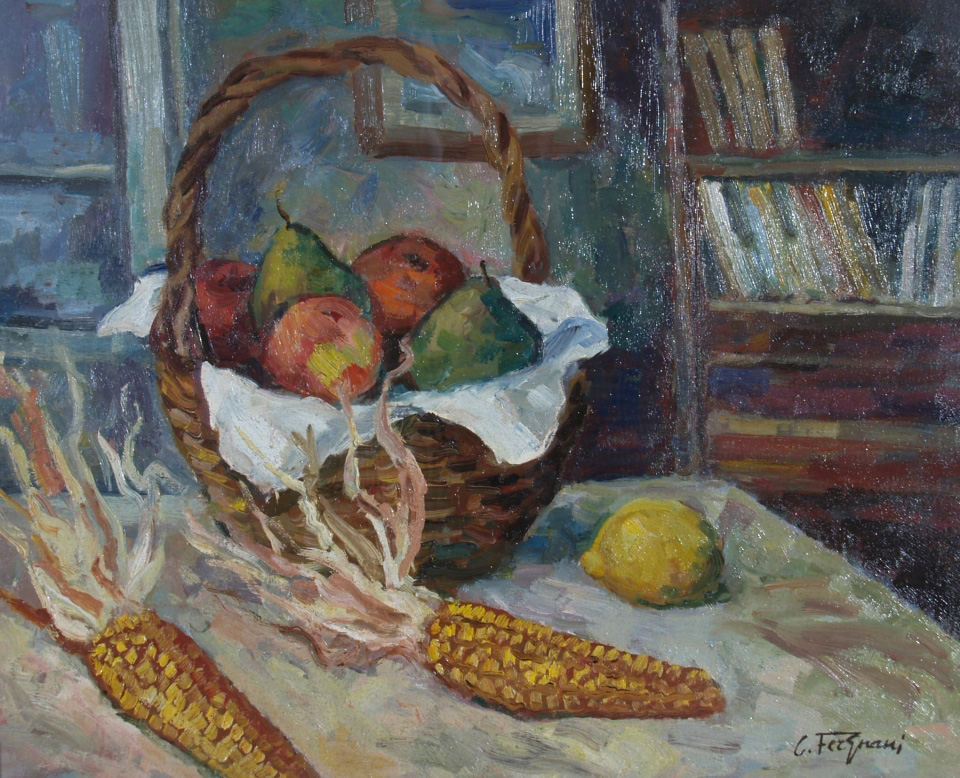 "Natura morta" 1980 Olio su tela cm. H: 40.00 L: 50.00 Firma in basso a destra. Titolo e firma al retro.