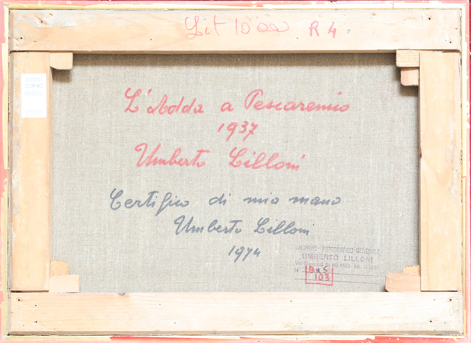 LILLONI UMBERTO (1898 - 1980) L'Adda a Pescarenico. 1937. Olio su tela . Cm 52,00 x 37,00. Firma in basso a destra. Al retro titolo, firma e anno. Firma per autentica datata 1974. Timbro Archivio Umberto Lilloni. Pubblicazione: Catalogo ragionato dei disegni e dei dipinti di Umberto Lilloni a cura di Renata Lilloni, Volume II, Skira Edizioni, p.389, tav. 263. Il catalogo riporta le dimensioni errate. Cornice presente