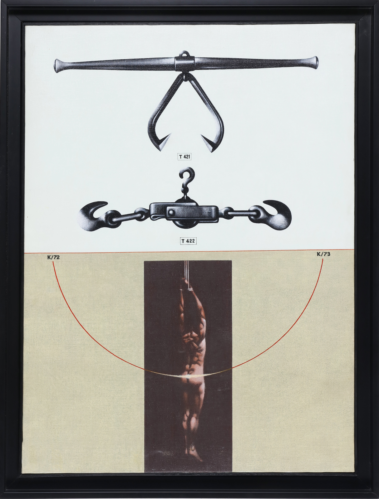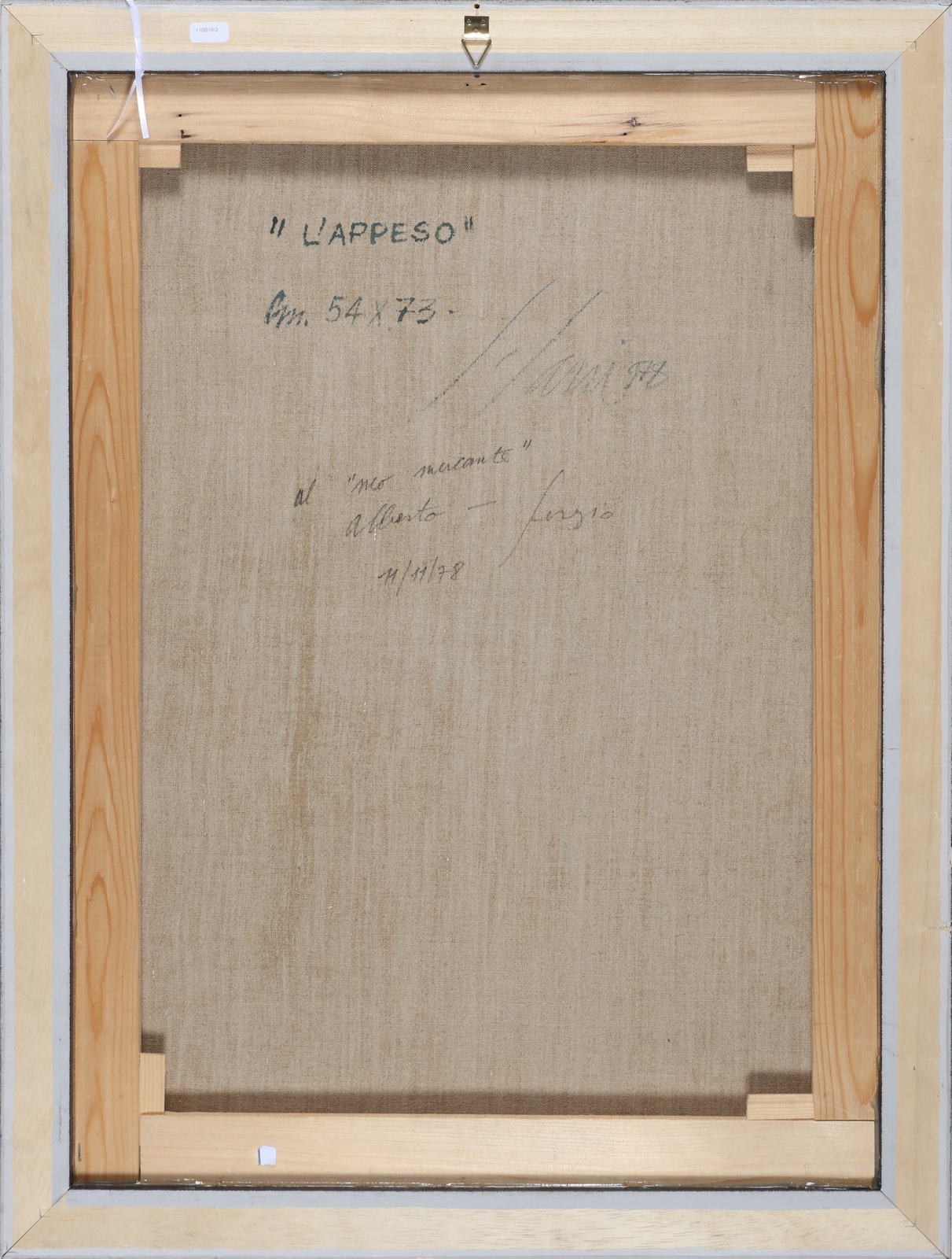 SARRI SERGIO (n. 1938) L'appeso. 1978. Acrilico su tela. Cm 54,00 x 73,00. Al retro titolo, firma e anno. Pubblicazioni: Sarri 1964 - 2008, Catalogo Ragionato, a cura di Ugo Paganini e Cristiano Ragni, Overtime Art Editore, 2009, pag. 192, tav. 506 ( Misure in catalogo non corrette). Cornice presente