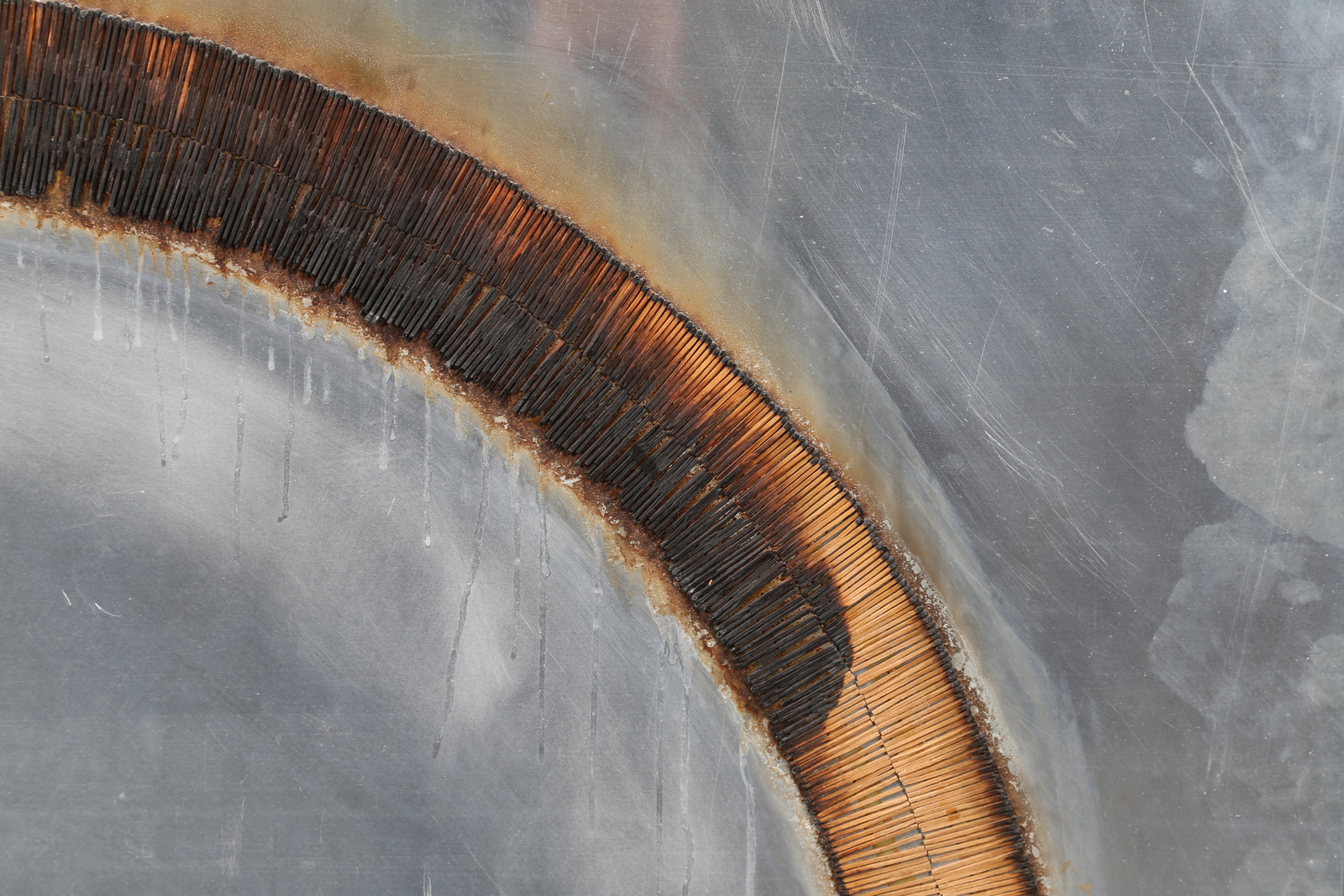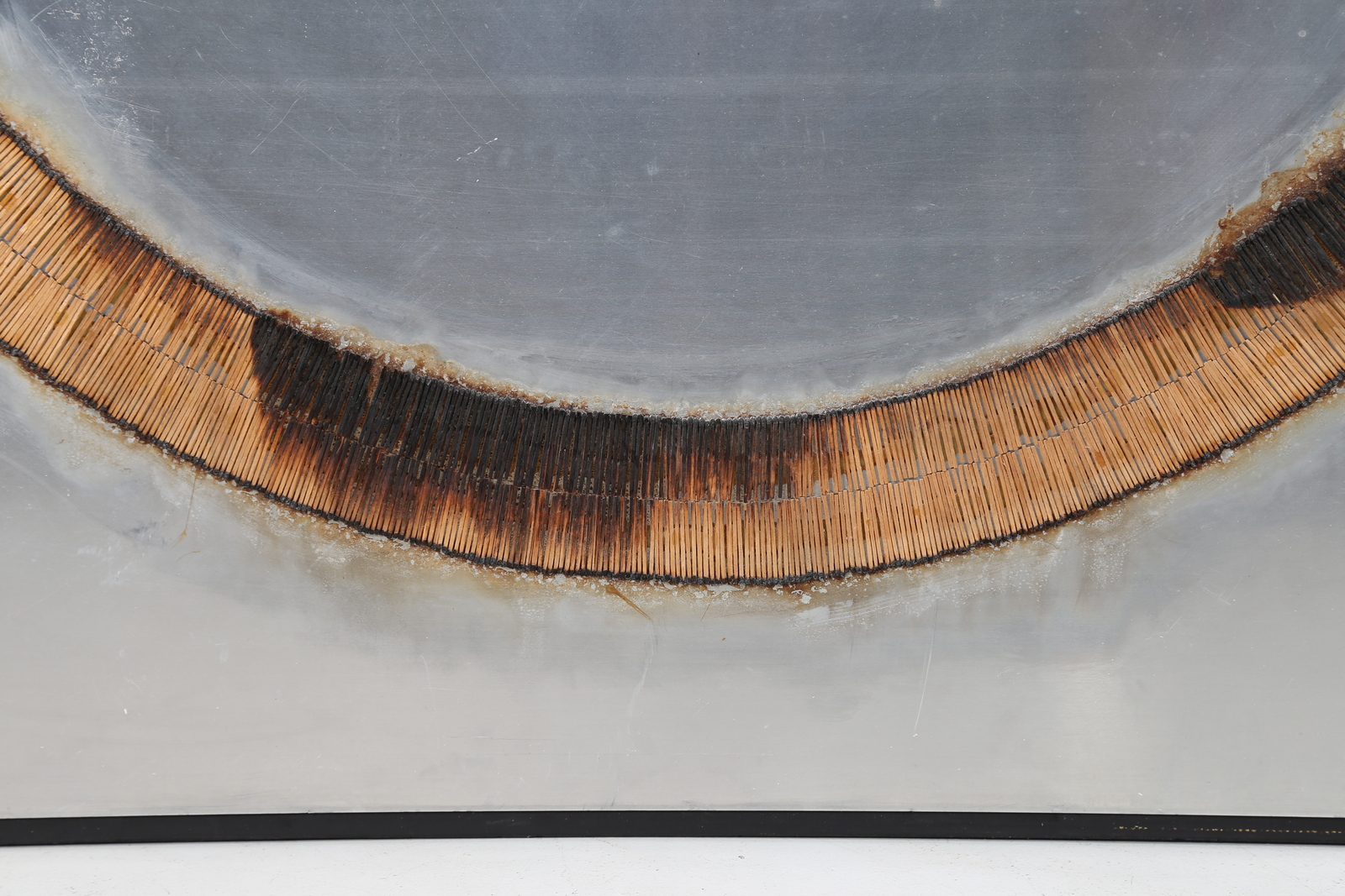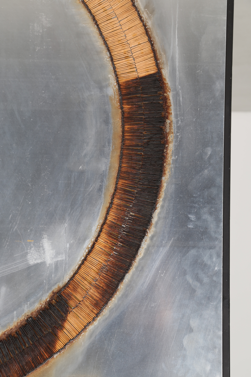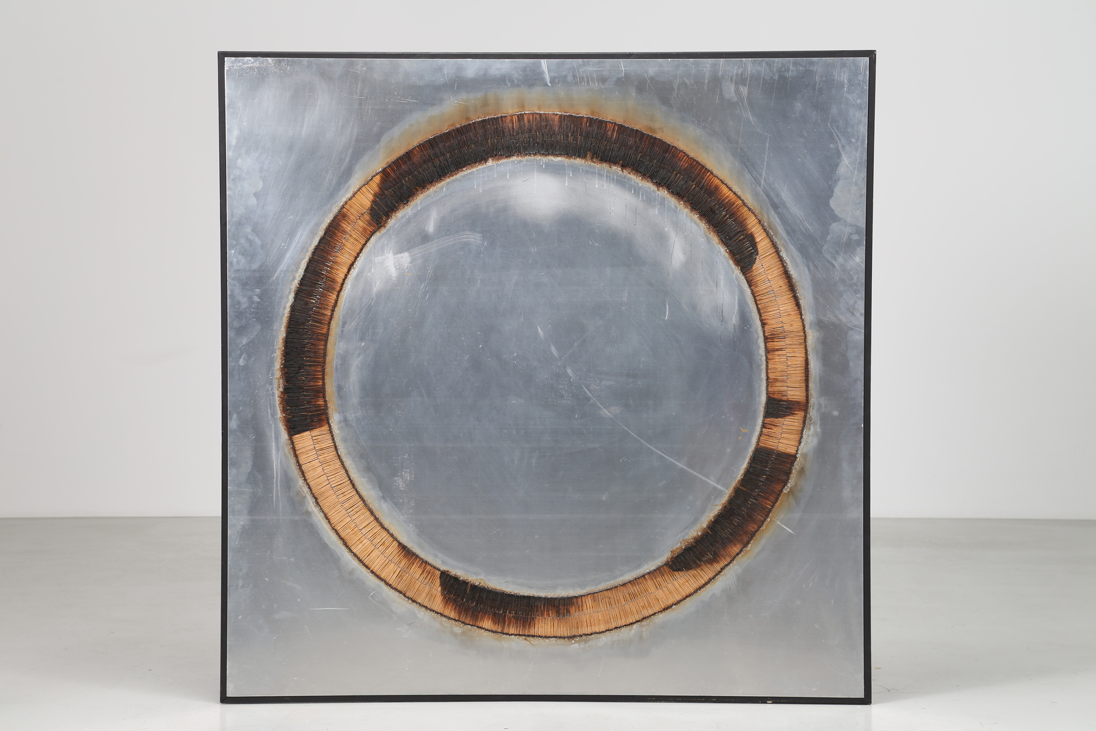 AUBERTIN BERNARD (1934 - 2015) Dessi de feu. 1974. Burnt matches on aluminium. Cm 145,00 x 145,00. At the back Centro Gallery, Brescia label with artist's signature and year. Artist's authenticity certificate on photo with Bernard Aubertin Archive, Brescia stamp. Provenance; Centro Gallery, Brescia.