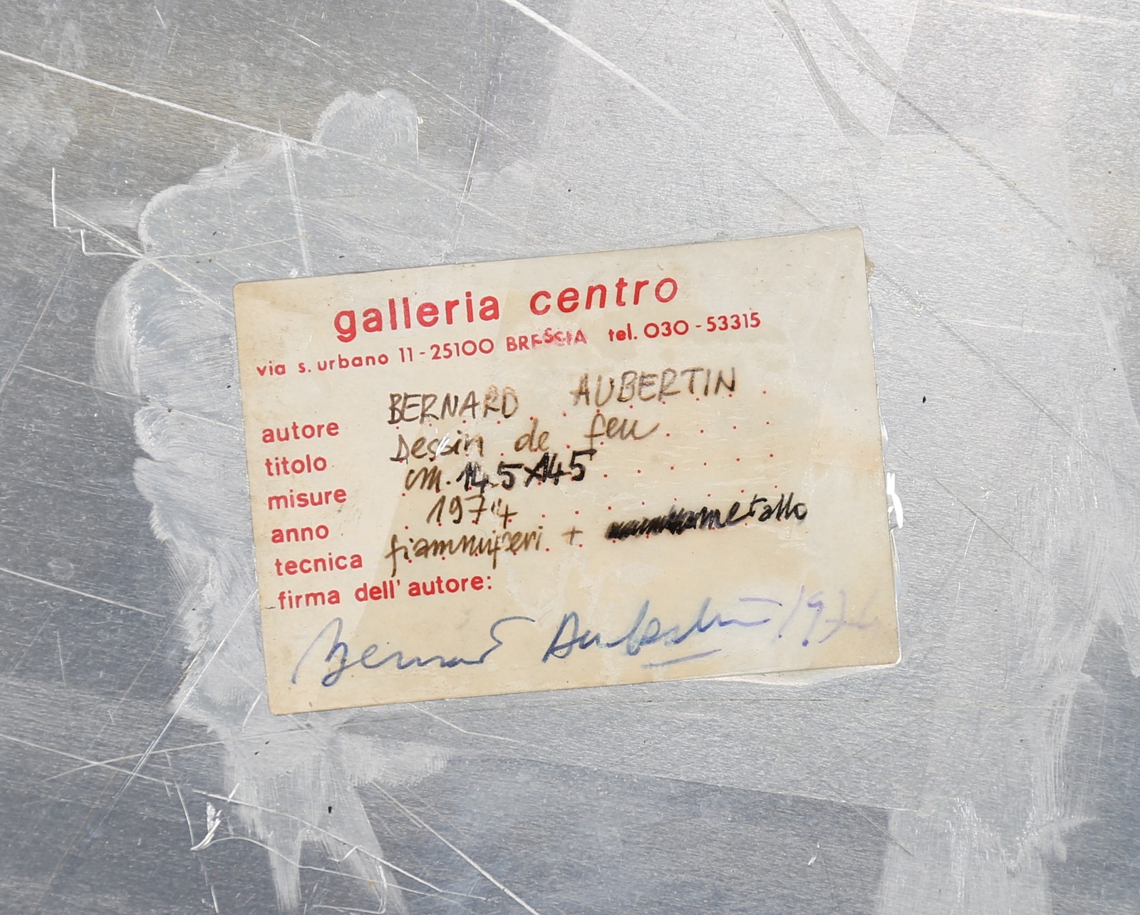 AUBERTIN BERNARD (1934 - 2015) Dessi de feu. 1974. Fiammiferi bruciati su alluminio. Cm 145,00 x 145,00. Al retro cartiglio della Galleria Centro, Brescia con firma dell'artista e anno. Autentica dell'artista su fotografia e timbro dell'Archivio Bernard Aubertin, Brescia. Provenienza: Galleria Centro, Brescia. A richiesta del cliente l'opera potrà essere archiviata e pubblicata sul catalogo generale di prossima uscita