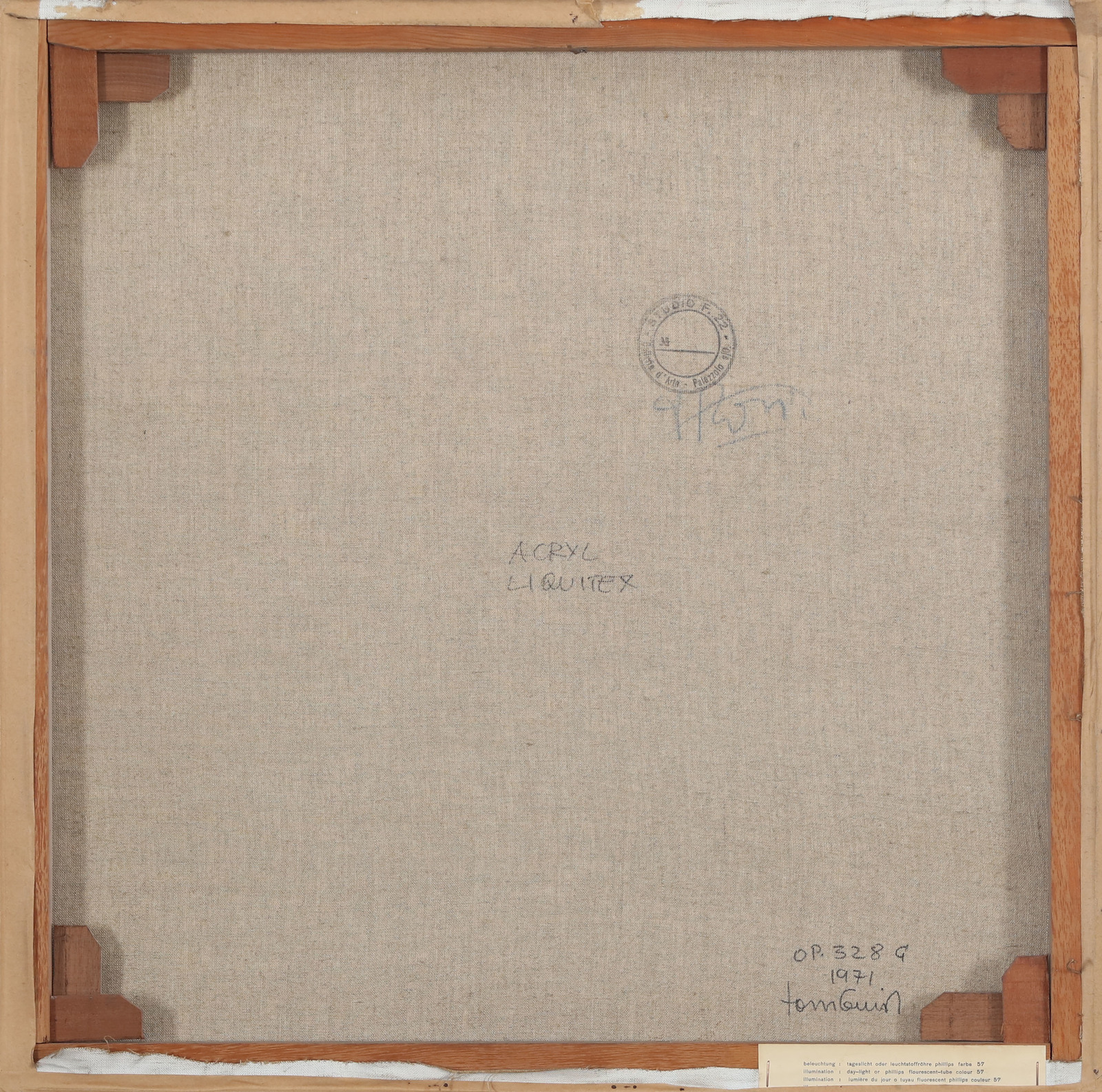 TORNQUIST JORRIT (n. 1938) OP328G. 1971. Olio su tela . Cm 54,00 x 56,00. Al retro firma, titolo e anno. Timbro Studio F22, Palazzolo. Opera archiviata presso l'Archivio Tornquist, Cisano Bergamasco come da documentazione fotografica allegata all'opera riportante il relativo numero d'inventario. Cornice presente