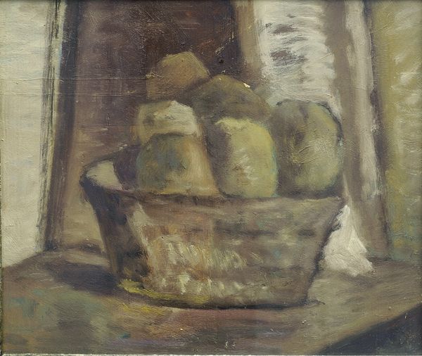 Mario Marcucci (Viareggio, 1910 - 1992) Cestino con patate, (1940) Olio su tavola, cm. 28,5x33 Firma in basso a sinistra.