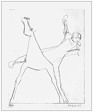 MARINO MARINI Pistoia 1901 – Viareggio 1980 L’idea 1950 Acquaforte es.31/50. Firma in b. a d. (56 x 38 foglio – 35,3 x 29,7 inc.) Tiratura: 15 es. num. arabi su carta Auvernie du Moulin – Richard de Bas + 3 es. ad personam + 35 es. num. arabi su carta Velin de Rives + XV es. Num. romani. Editore: XX° Siecle, Parigi, 1971. Stampatore: Lacouriere, Parigi. L’opera fa parte della cartella “Album n°1” composta da 12 acqueforti con prefazione di Gualtieri di San Lazzaro, edita da XX° Siecle, Parigi e Leon Amiel, New York. Pubbl.: “Marino Marini catalogo ragionato dell’Opera grafica (incisioni e litografie 1919-1980)” Edizioni Graphis Arte, Livorno, p.39-A34, p.202-A34. B.A.: 300