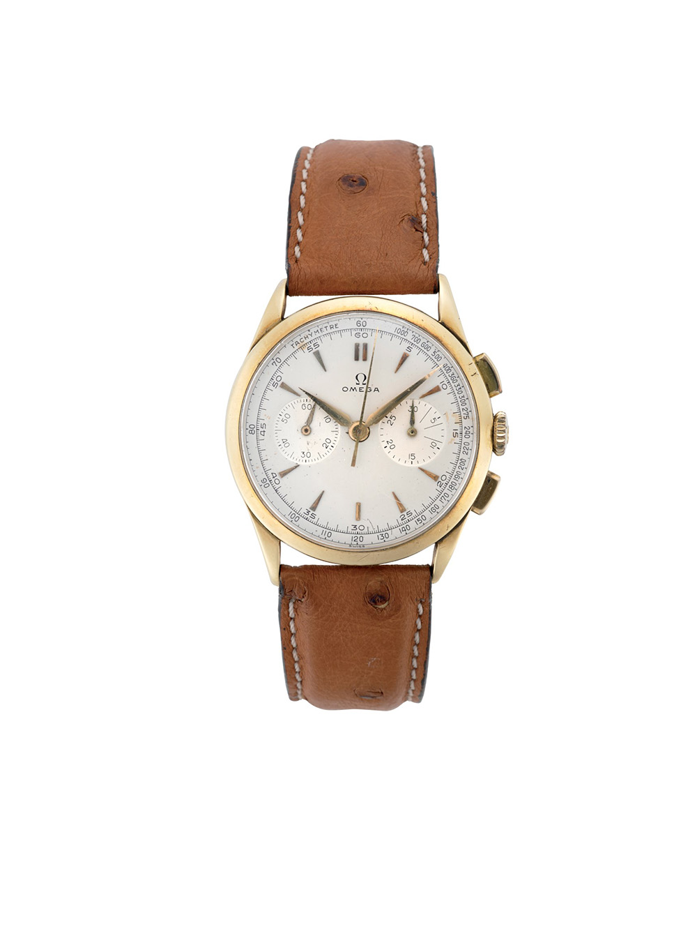 Lotto 579 | OMEGA, CronografoOrologio da polso da uomo in oro 18KAnni '50Quadrante,...