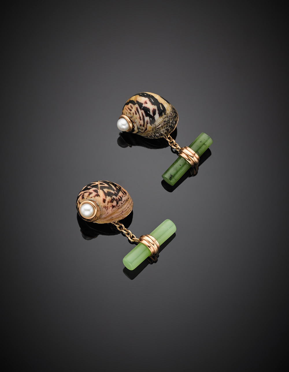 Gemelli in oro rosso con conchiglia, nefrite e rifiniti con perla bianca di coltura, g 11,26.