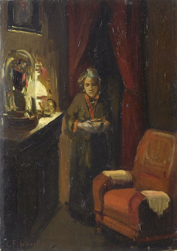 Cafiero Filippelli (Livorno, 1889 - 1973) Figura in un interno Olio su tavoletta, cm. 35x25 Firma in basso a destra. Sul verso: due timbri galleria Kùpros; due timbri Botteghina d'Arte, Rosignano S.