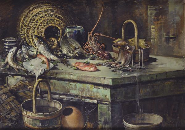 Felice Giordano (Napoli, 1880 - Capri, 1964) Natura morta con pesci Olio su tela, cm. 100x140,5 Firma in basso a destra.
