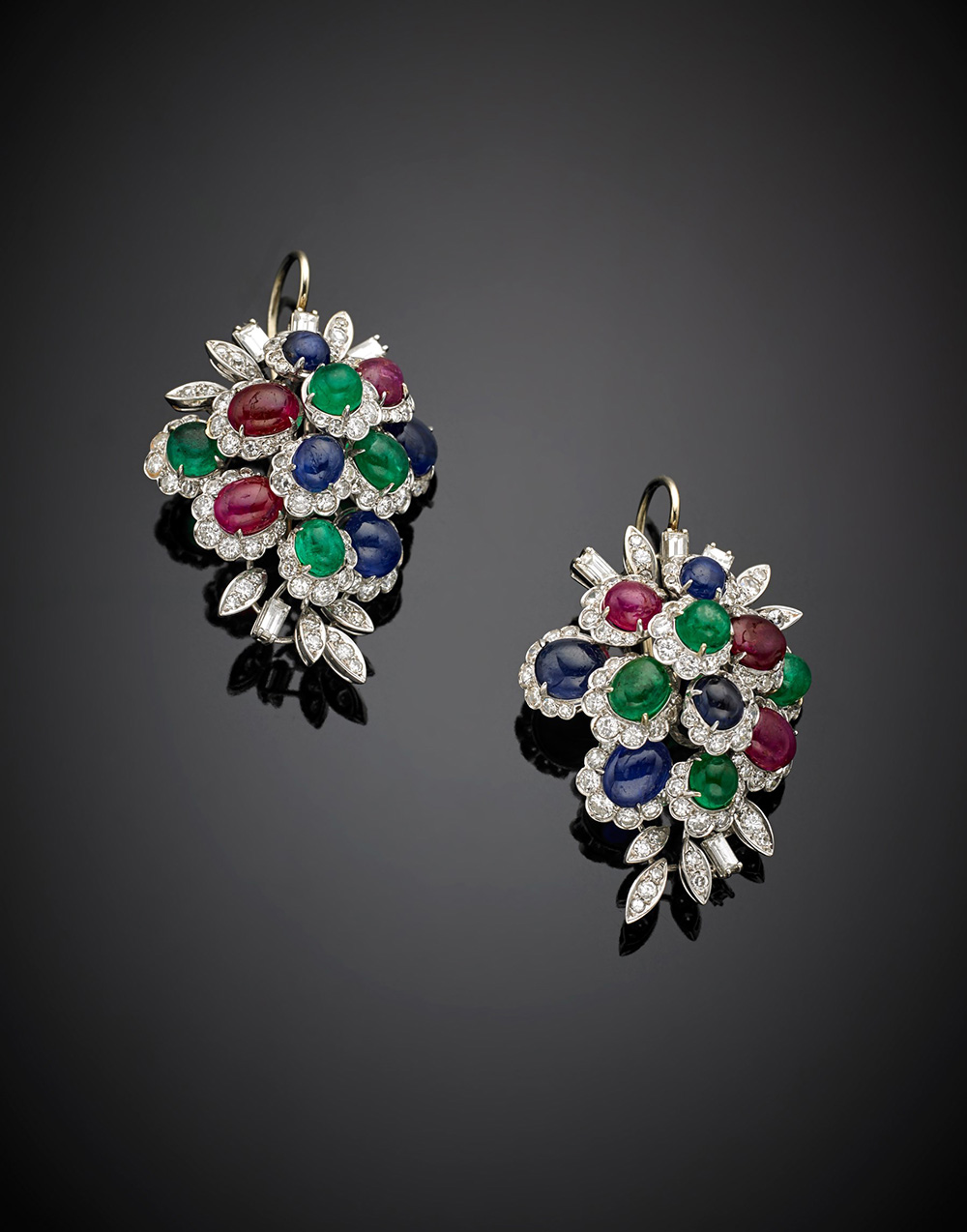 Orecchini pendenti a monachella a motivo floreale in oro bianco, diamanti rotondi e a baguette, con rubini, zaffiri e smeraldi cabochon, g 24,40, lungh. cm circa.