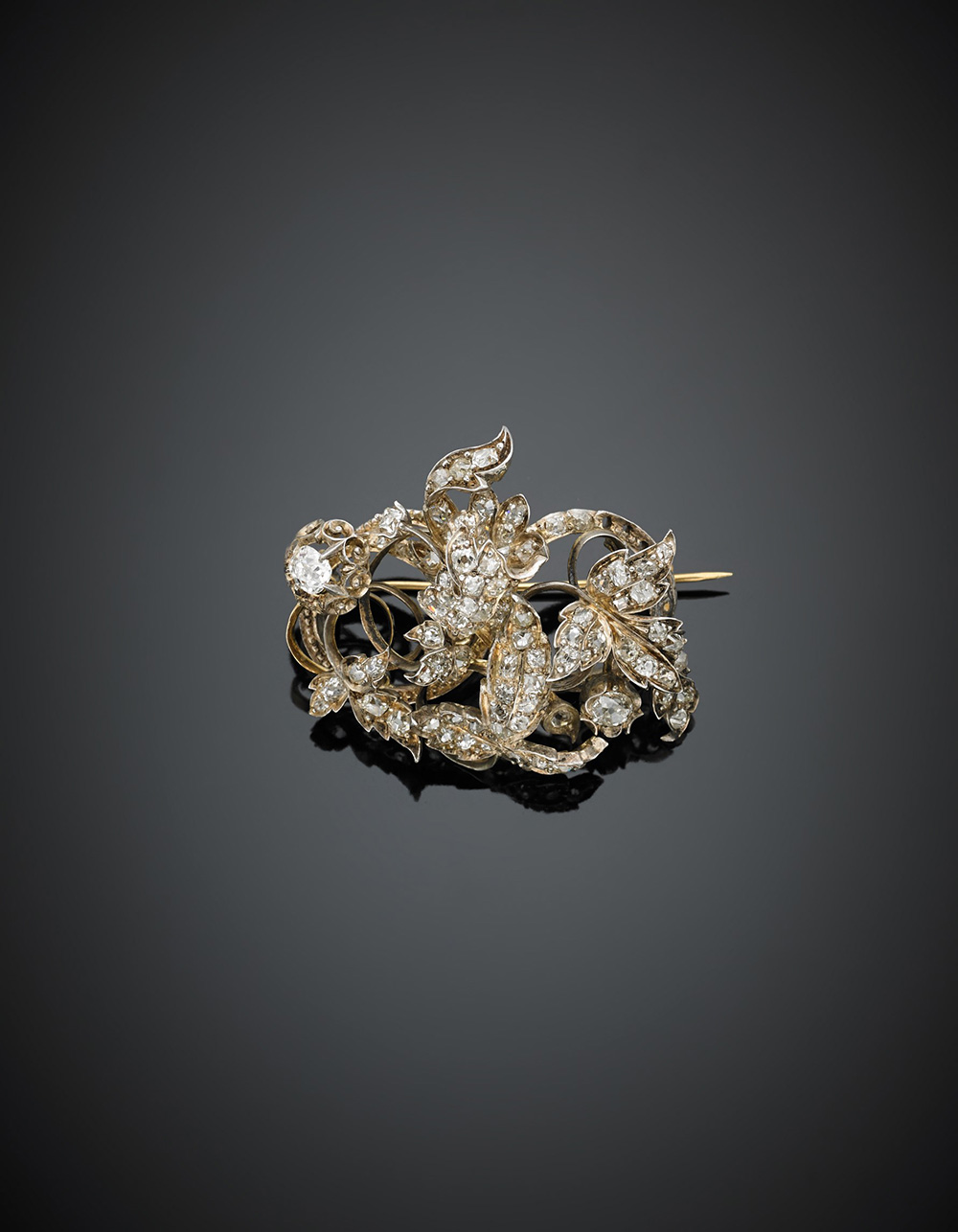 Spilla floreale in oro giallo e argento rifinita con diamanti vecchio taglio, g 16,60, lungh. cm 4,20 circa.