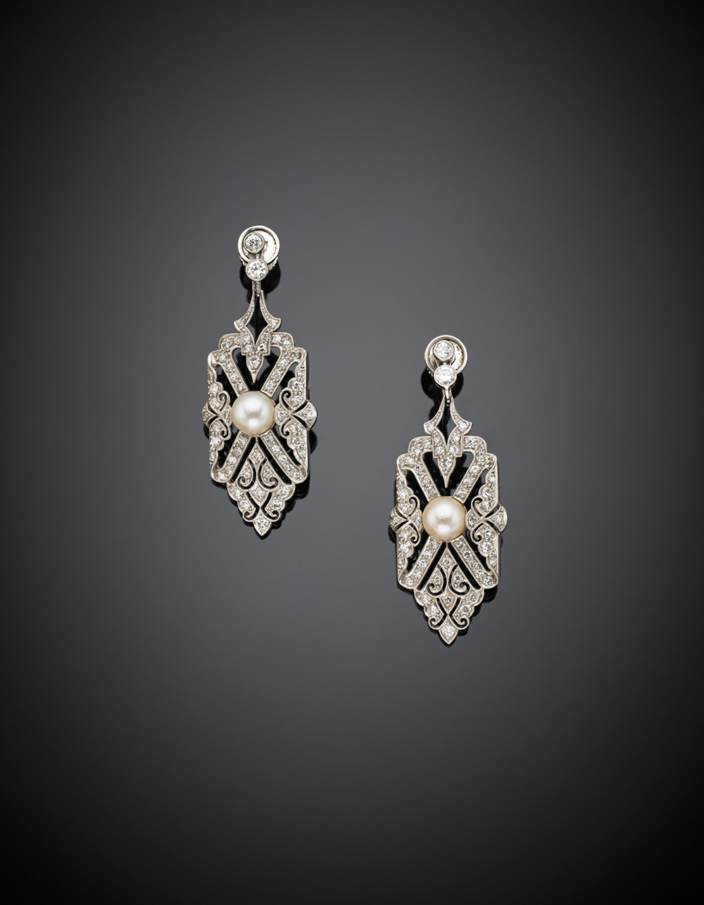Orecchini a vite pendenti in platino con diamanti e perle, g 16,53, lungh. cm 5,20 circa.