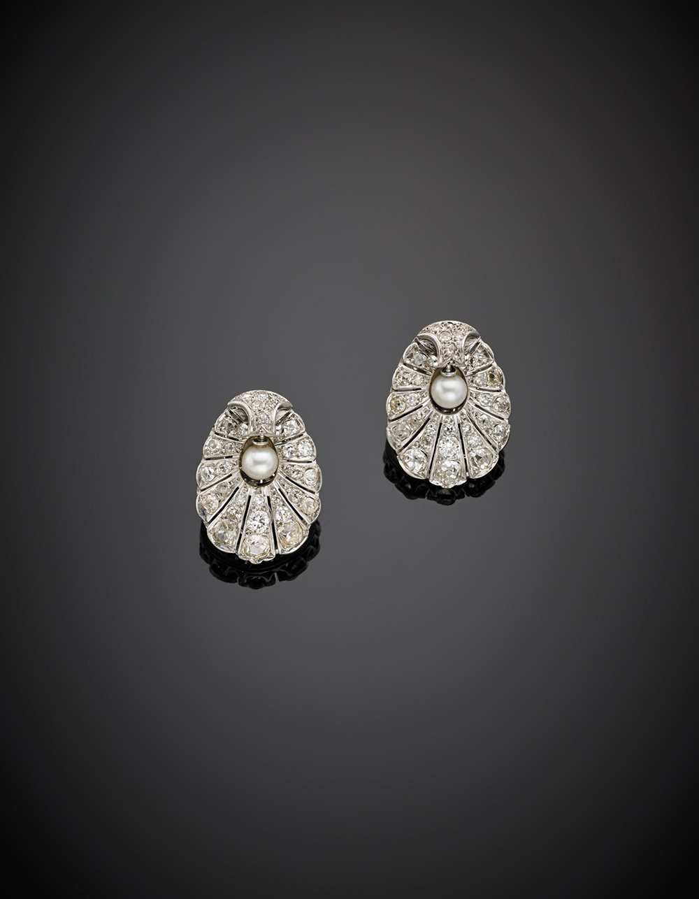 Orecchini a guisa di conchiglia in oro bianco, diamanti e due perle al centro, g 15,20, lungh. cm 2,50 circa.