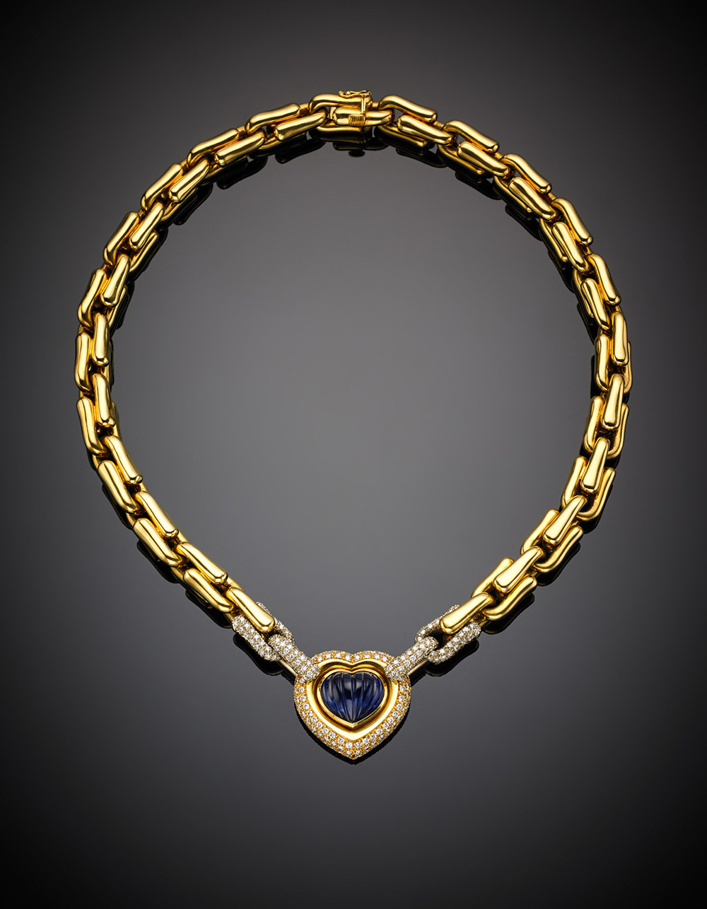 Collier a catena in oro giallo con al centro uno zaffiro a cuore scolpito e rifinito in diamanti a pavè, g 118,91, lungh. cm 47 circa.*