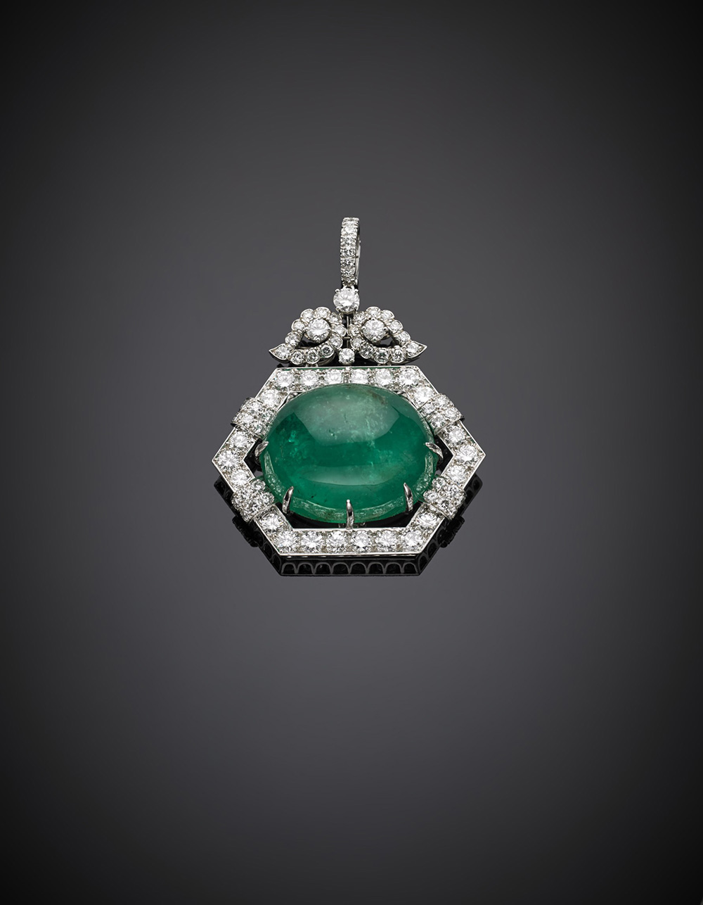 White gold diamond, in all ct. 8.20 circa hexagonal pendant with large cabochon emerald ct. 80 circa, small diamond leaves on top, g 39.86, length cm 6.20, width cm 4.20 circa.Appended Gemmological Report CISGEM n.7919 19/10/2017 Milano.