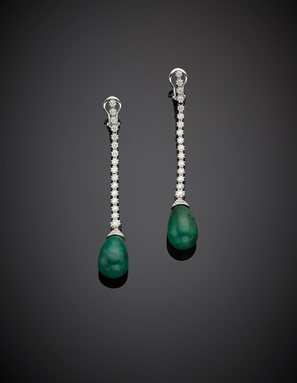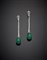 Orecchini pendenti, in oro bianco con fila di diamanti a sostenere due gocce di smeraldo di mm 19x11 circa, g 14,03, lungh. cm 7,10 circa.
