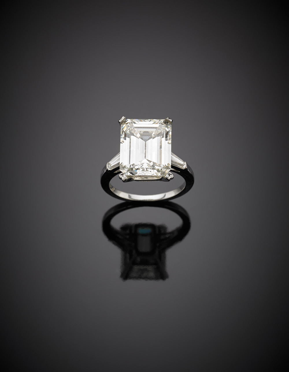 Anello in oro bianco con grande diamante di ct. 8,67 rettangolare taglio a gradini, g 7,70 misura 13/53.