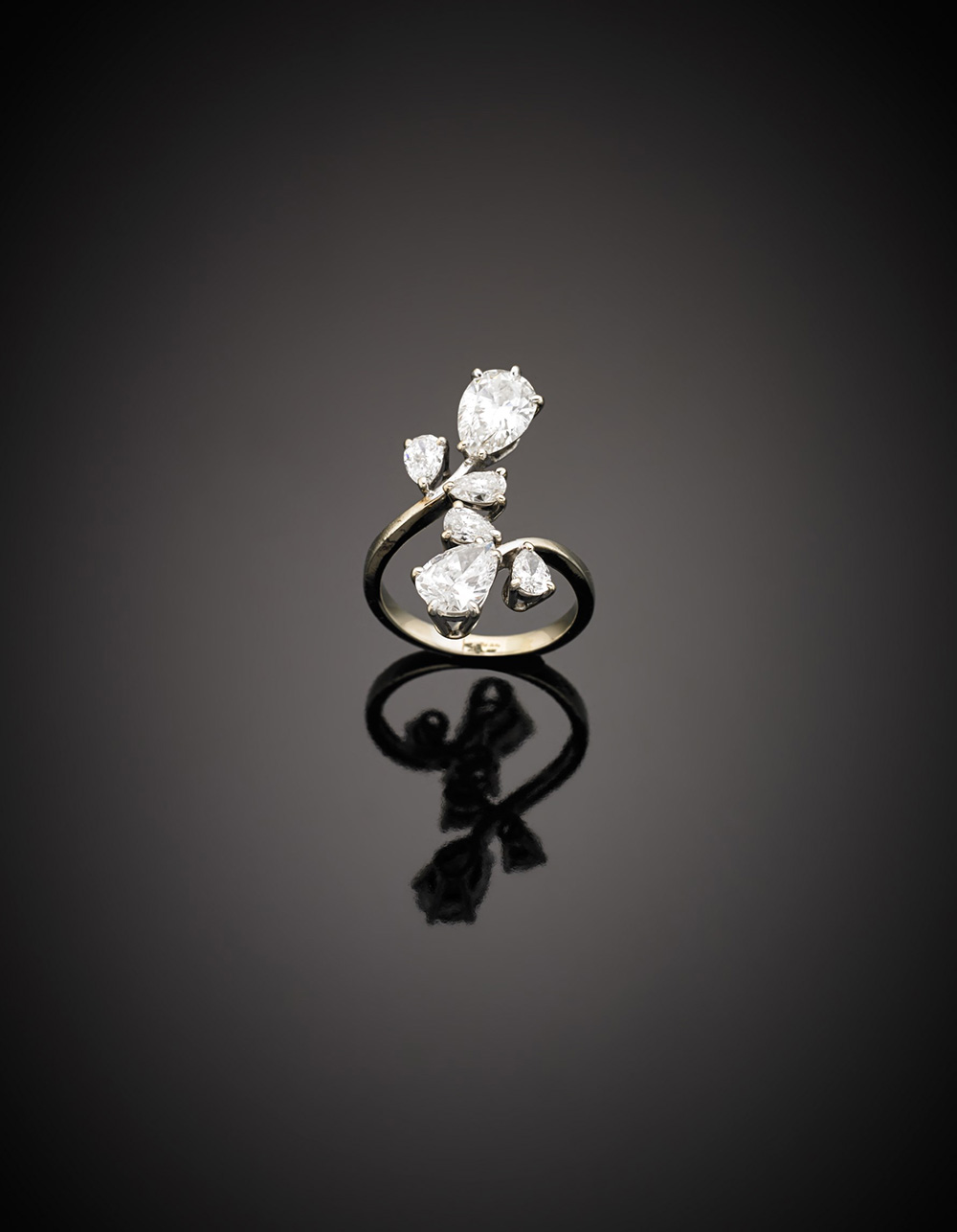 Anello in oro bianco con sei diamanti a goccia, i due più grandi...