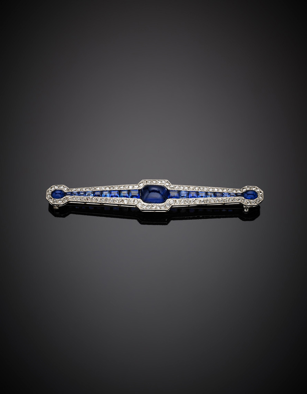 Broche in oro bianco e platino con diamanti, zaffiri tapered e cabochon, n. di inventario 26-877, g 7,50. Marchio "testa d'aquila" e "testa di cane"