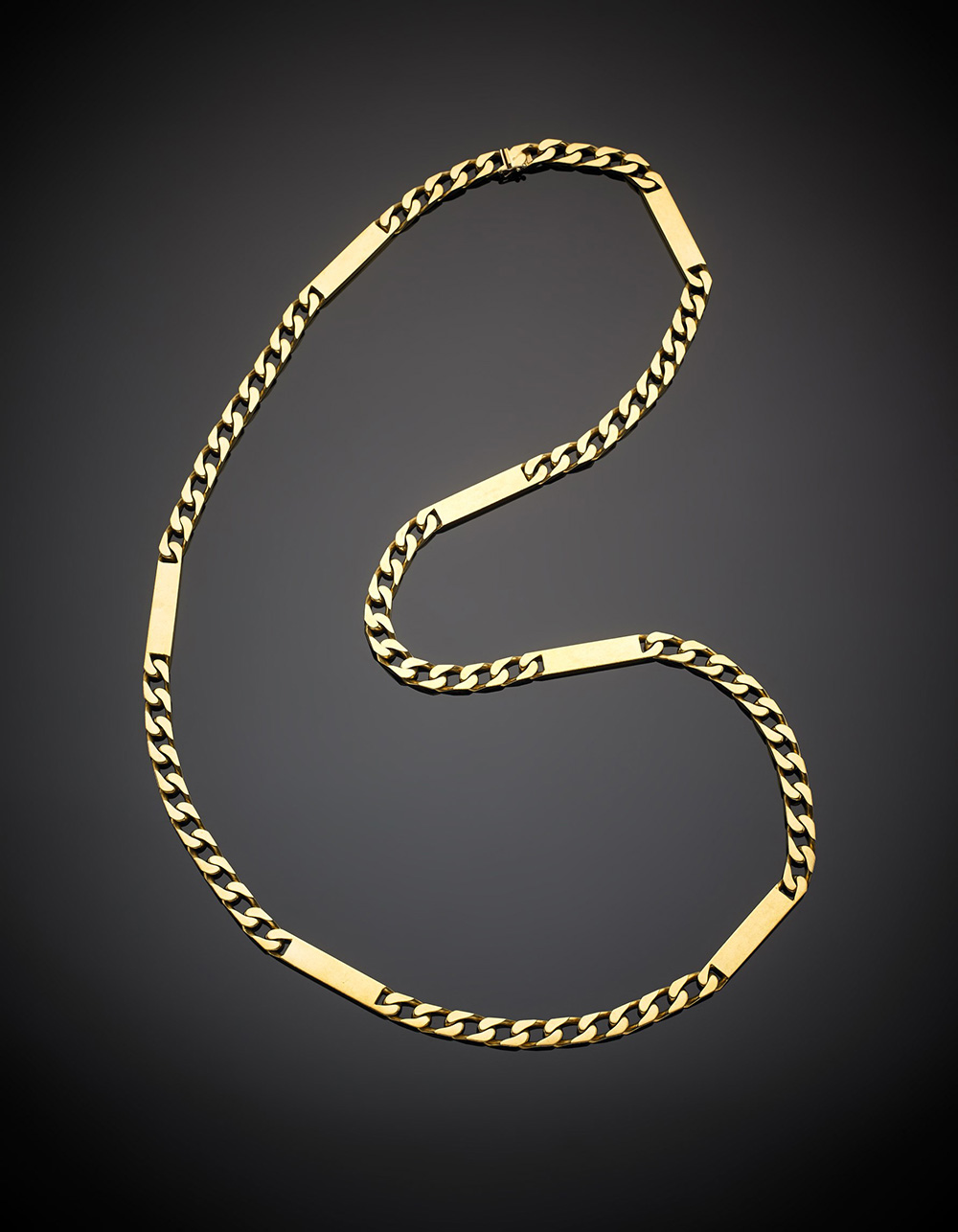 Catena lunga in oro giallo a maglia groumette alternata da piastre rettangolari, g 221,6, lungh. cm 93 circa. Marcato 166 VI