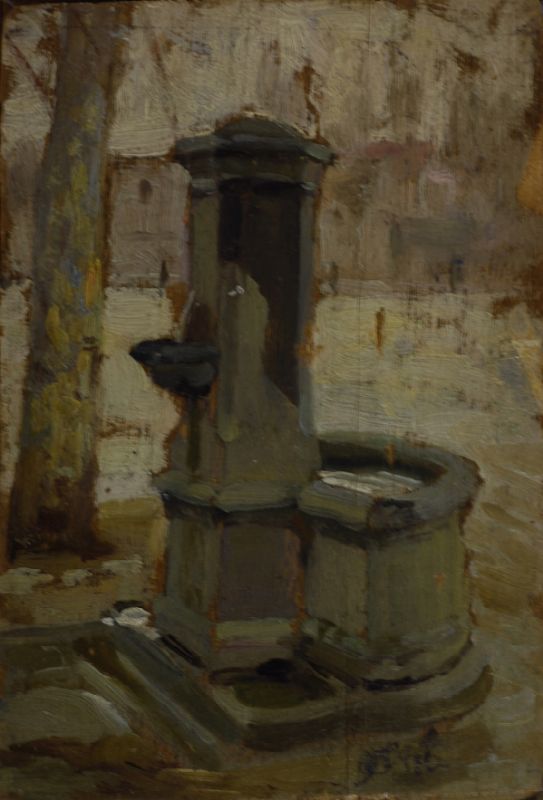 Luigi Gioli (San Frediano a Settimo, 1854 - Firenze, 1947) Fontanella alla Fortezza Olio su tavola, cm. 12,5x9 Sigla in basso a destra. Si tratta di studio per il dipinto "L'abbeveratoio" databile al 1896 circa.