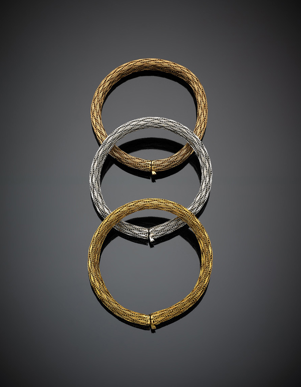 Tre bracciali a maglia intrecciata in oro bianco, giallo e rosso, complessivi g 97,4, lungh. cm 19,3 circa.