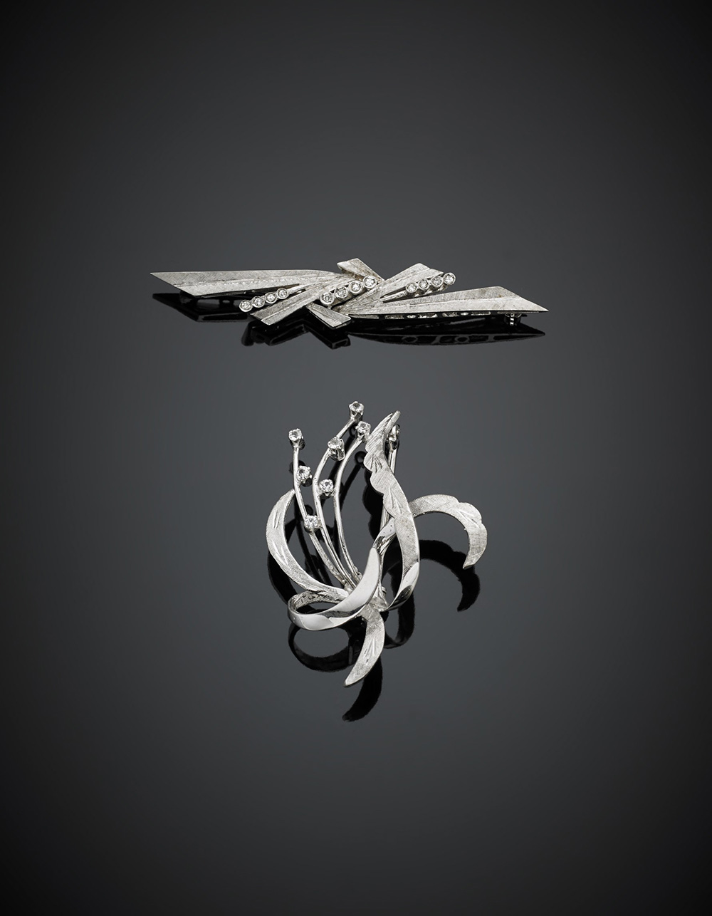 Lotto 1548 | Lotto di due spille in oro bianco lucido e satinato di forme e dimensioni...