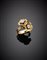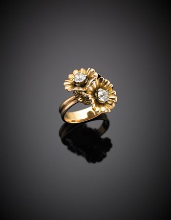 Anello in oro giallo a fiori con due diamanti, g 7,62 misura 18/58.
