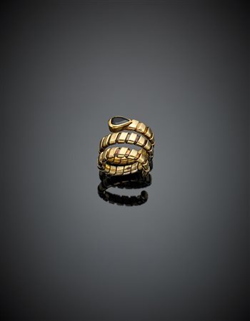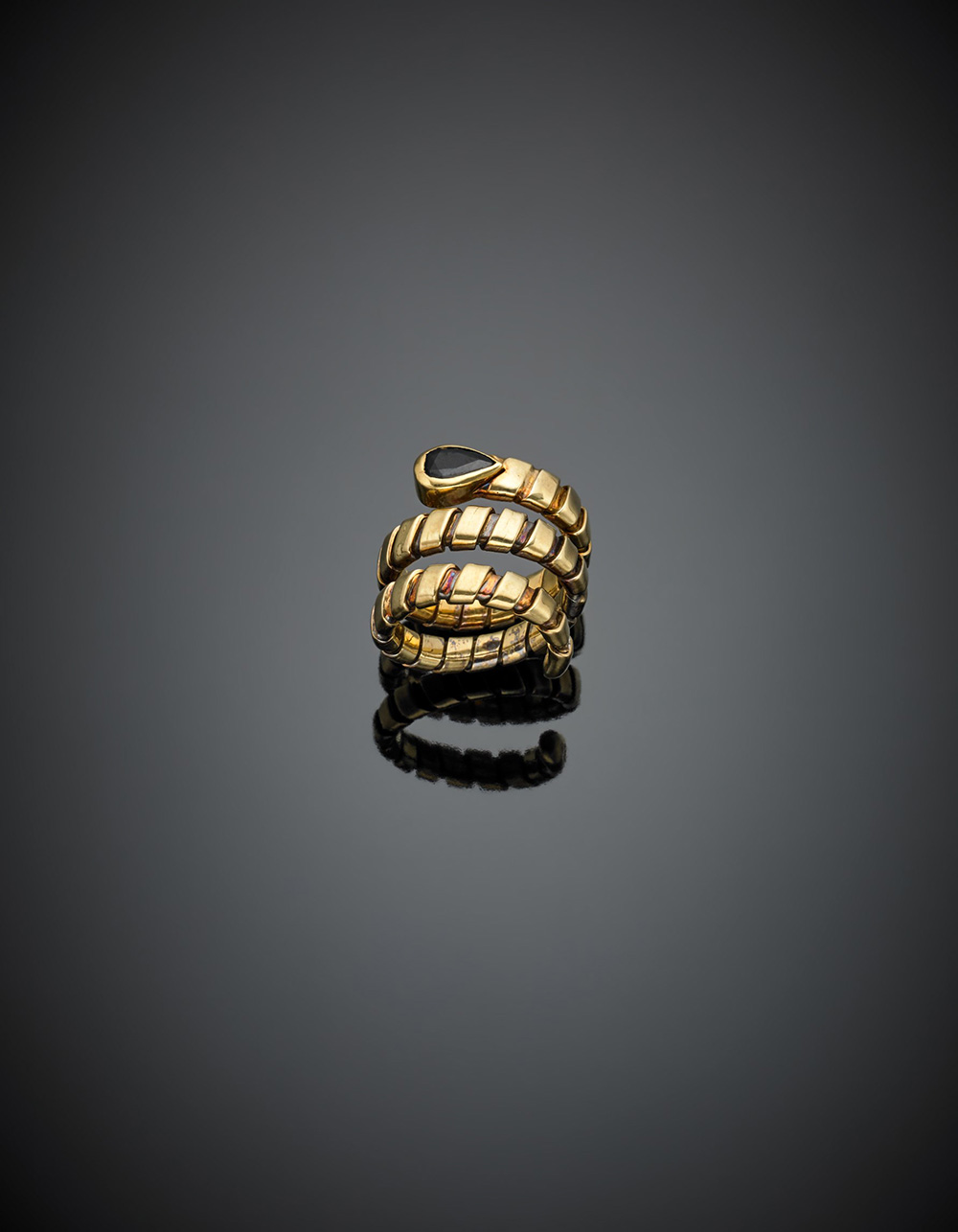 Anello a molla a guisa di serpente in oro giallo con zaffiro a goccia, g 12,02 misura 13-14/53-54.