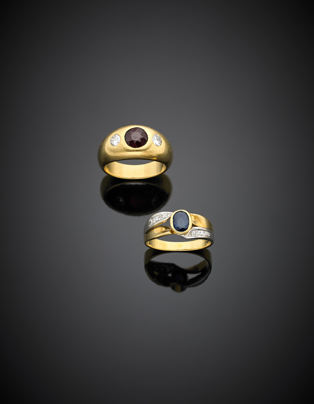 Lot of two bi-coloured gold diamond rings, one with a sapphire, the other with a red violet garnet, g 12.90 size 13/53 e 12/52.