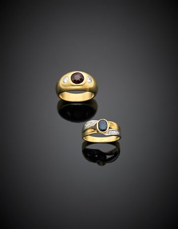 Lotto composto da due anelli in oro giallo e bianco, con diamanti e uno zaffiro il primo, un granato viola il secondo, g 12,90 misura 13/53 e 12/52.
