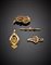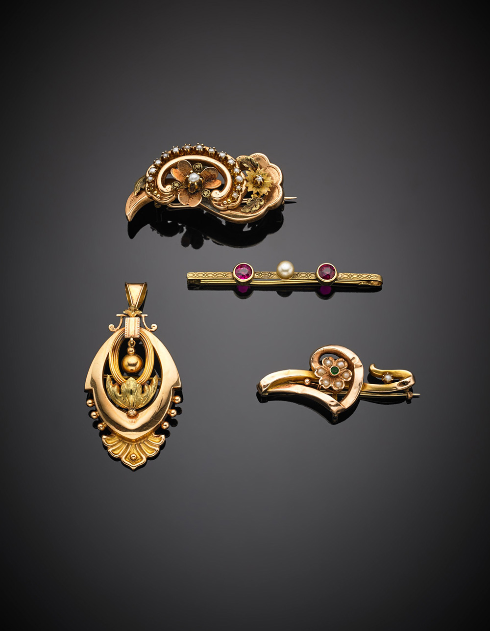 Lotto composto da: ciondolo, spilla in oro e perline, spilla con piccole perle e smeraldo a guisa di nota musicale, spilla in oro con due rubini e una perla, complessivi g 15,96.
