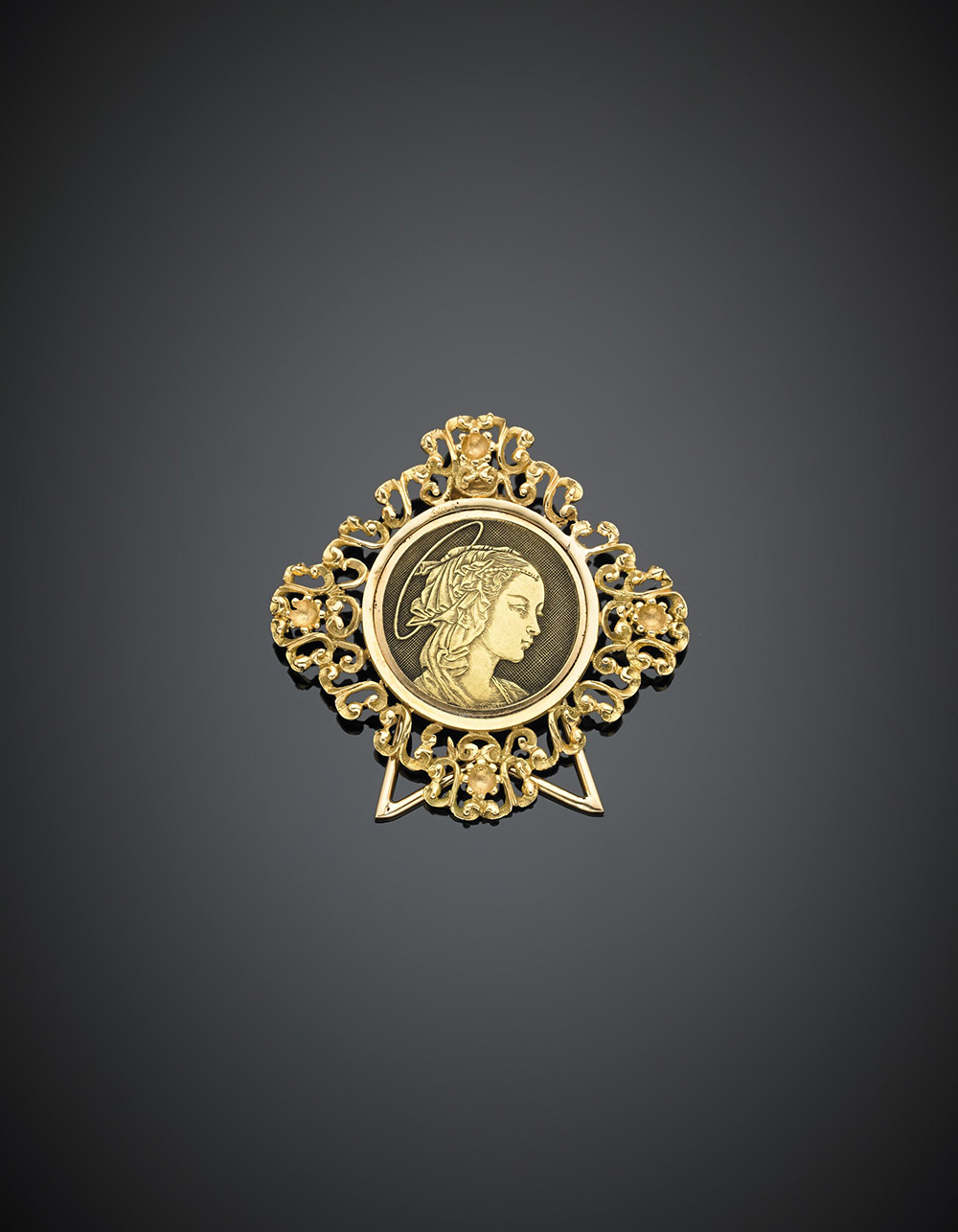 Oggetto da tavolo in oro giallo con al centro la figura di Madonna, g 12,30, lungh. cm 4,20 circa.