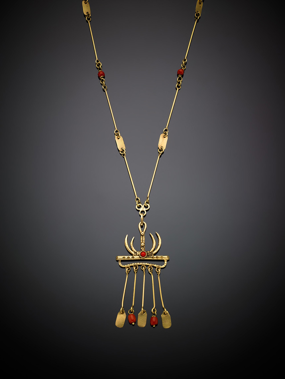 Catena con centrale a stecche e placche in oro giallo con distanziatori in boules in corallo rosso, g 30,46, lungh. cm 80 circa. Lungh. centrale cm 7