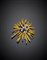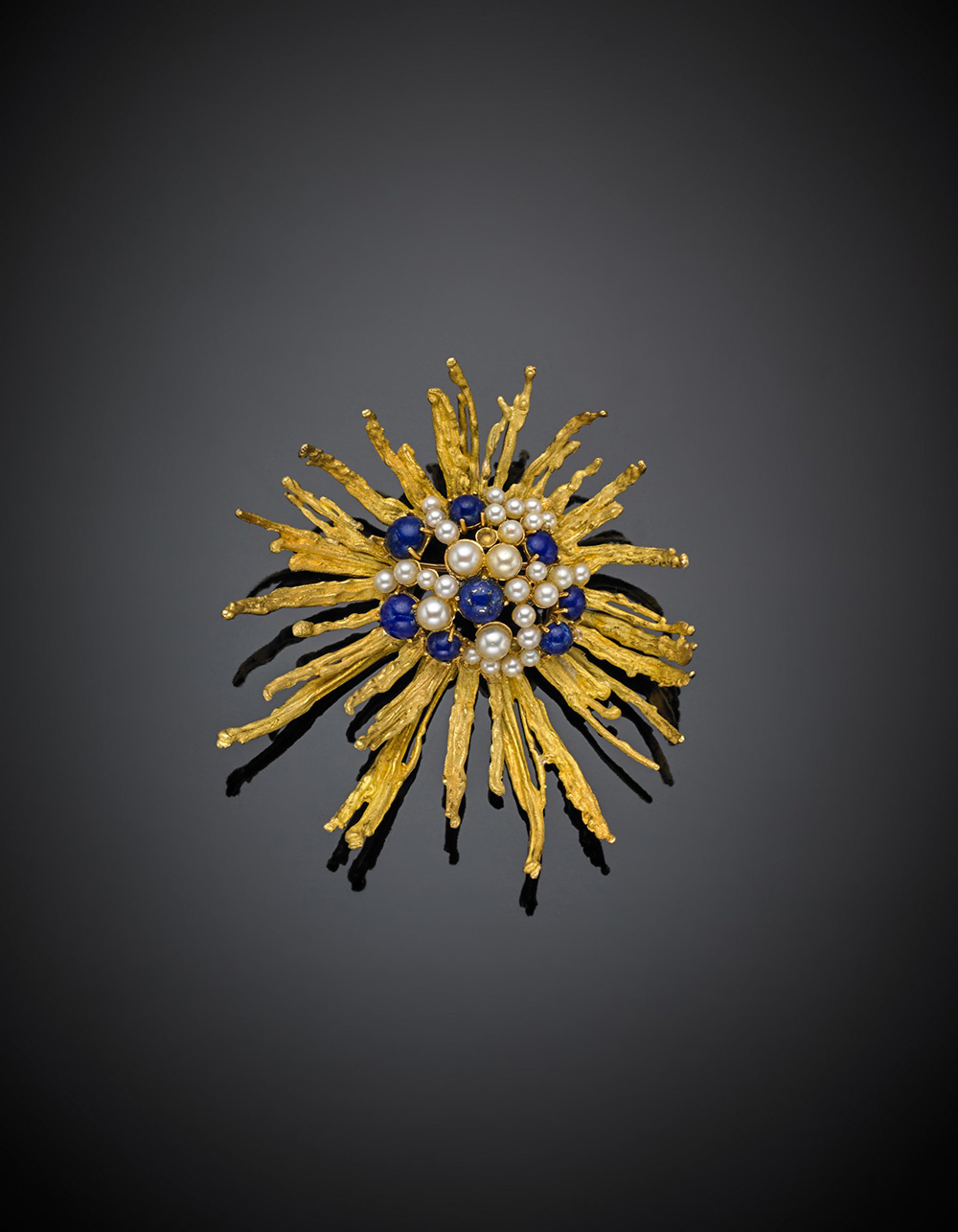 Spilla a guisa di fiore in oro sabbiato, perle e lapis e sodalite, g 21,89, diam. cm 6,50.