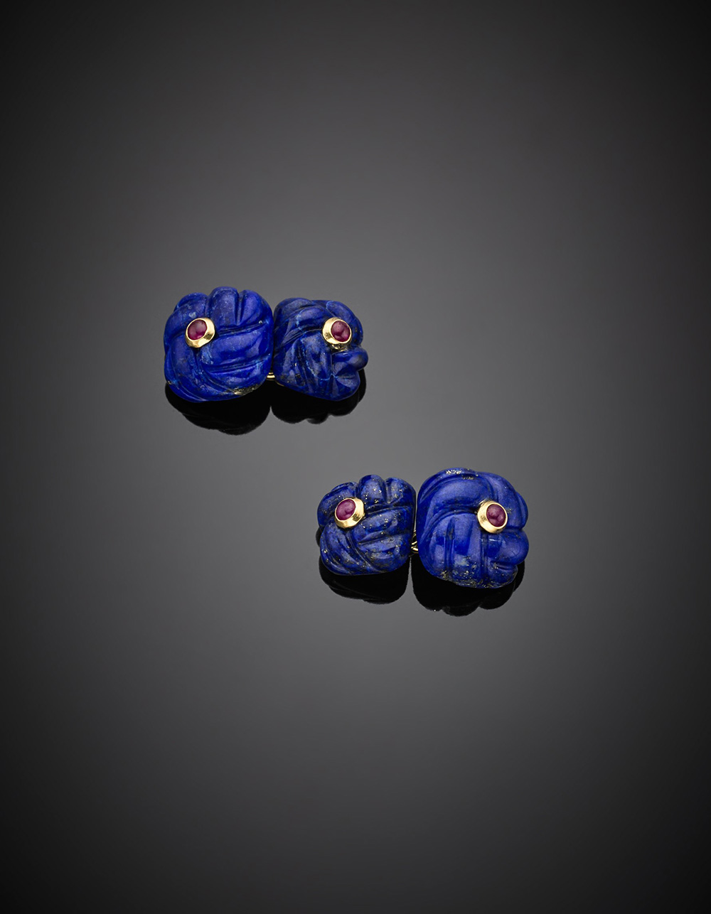 Gemelli in oro giallo con lapislazzuli scolpito e rubini cabochon, g 9,66.