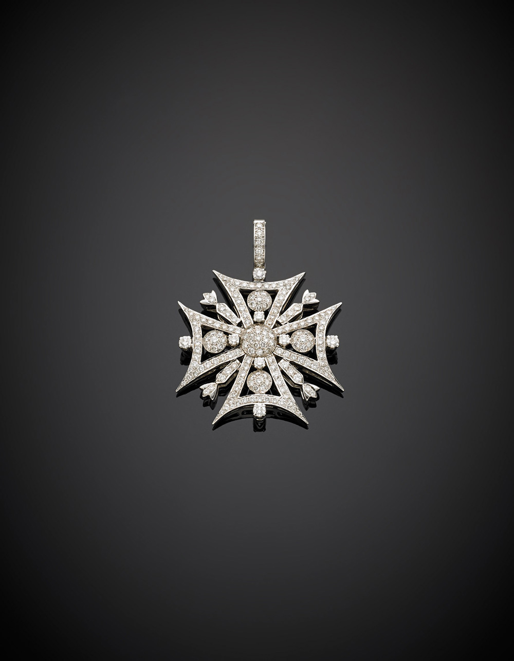 Croce teutonica in oro bianco e diamanti rotondi, g 11,75, lungh. cm 4,20, largh. cm 3,10 circa.