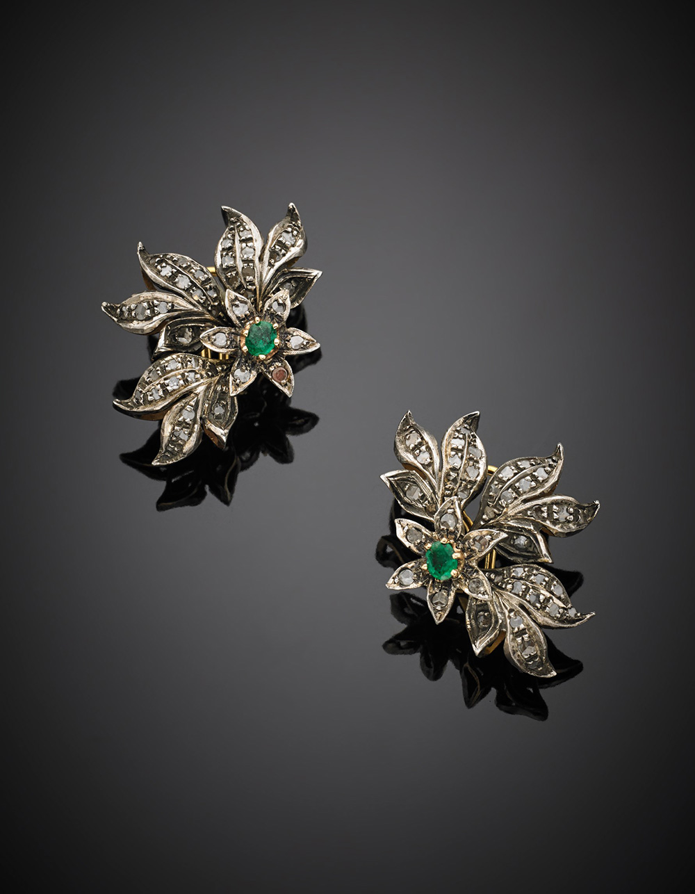 Orecchini in oro giallo 585/1000 e argento a guisa di fiore con diamanti e smeraldi g 21,60, lungh. cm 4,10 circa.